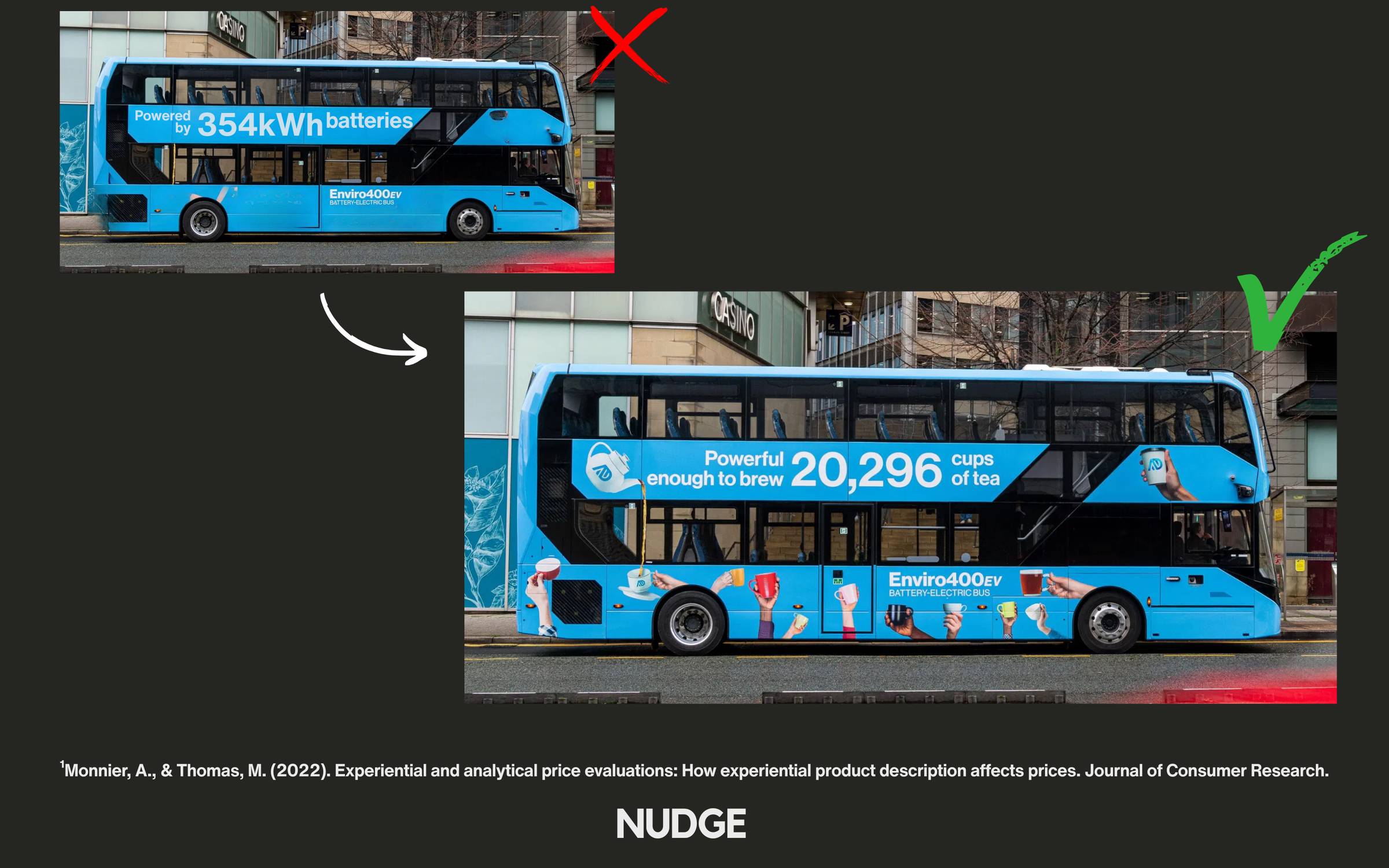 Concrete Phrases Read online Which electric bus would stick in your mind? It's not even a competition. Copy that's easy to visualise is easy to memorise. In 2021, Richard Shotton¹ showed participants a number of vague phrases, like 'innovative quality', and then some concrete phrases, e.g., 'money in your pocket'. Shotton’s concrete phrases were 8.6x more likely to be remembered. Richard Shotton's Concrete Phrases Study He’d proved the concrete phrases' effect, a phenomenon first discovered...