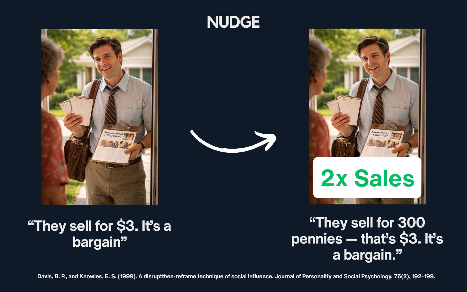 Disrupt Then Reframe Read online In his fantastic book 59 Seconds, Richard Wiseman¹ explains the “disrupt, then reframe” approach. The tactic briefly jolts someone out of autopilot with something unexpected, then follows with a straightforward request. In several experiments, researchers went door to door selling notepads for charity. The salesman would either say: 1️⃣ “They sell for $3. It’s a bargain.” 2️⃣ Or, they would introduce a small disruption: “They sell for 300 pennies — that’s $3....
